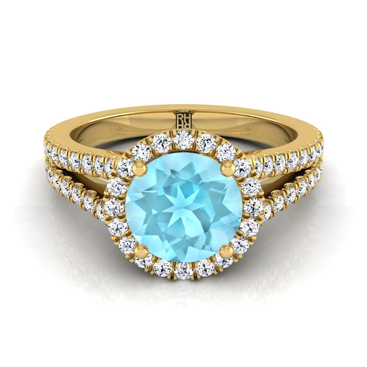 18K Yellow Gold Round Brilliant Aquamarine Halo Center with French Pave Split Shank Engagement Ring -3/8ctw