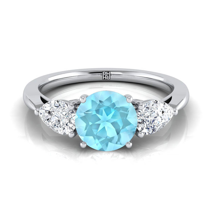 18K White Gold Round Brilliant Aquamarine Perfectly Matched Pear Shaped Three Diamond Engagement Ring -7/8ctw
