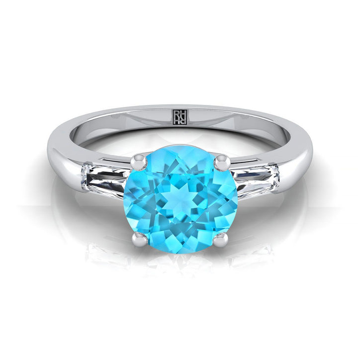 18K White Gold Round Brilliant Swiss Blue Topaz Three Stone Tapered Baguette Engagement Ring -1/5ctw