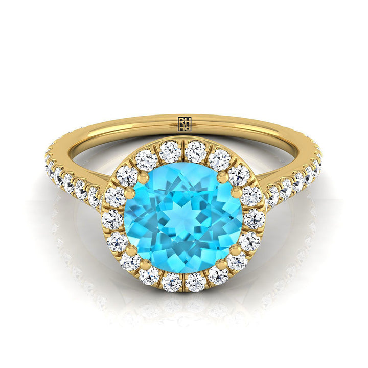 18K Yellow Gold Round Brilliant Swiss Blue Topaz Horizontal Fancy East West Diamond Halo Engagement Ring -1/2ctw