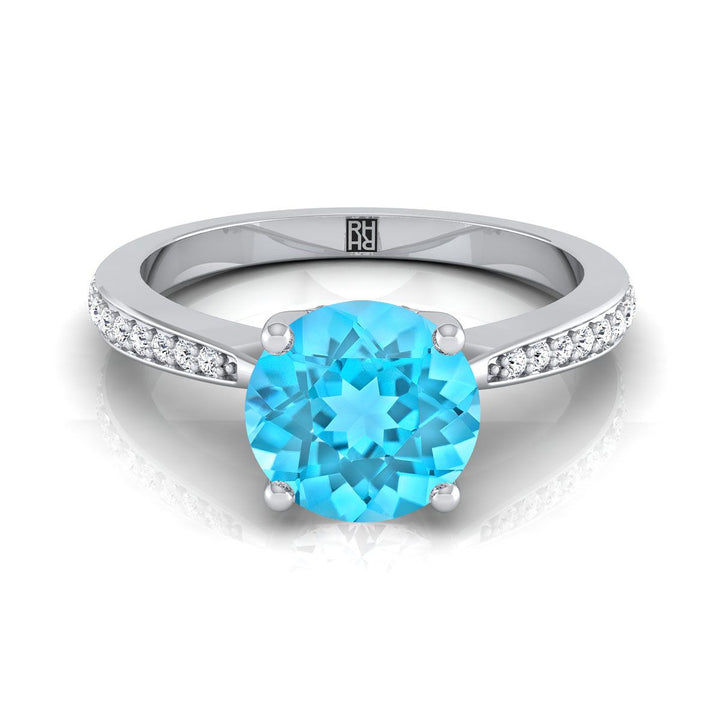 18K White Gold Round Brilliant Swiss Blue Topaz Tapered Pave Diamond Engagement Ring -1/8ctw