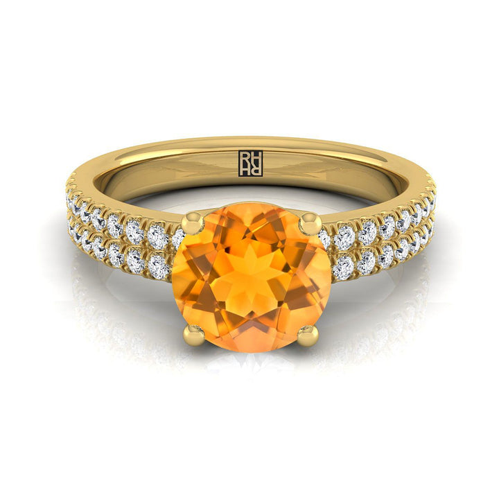 14K Yellow Gold Round Brilliant Citrine Double Pave Diamond Row Engagement Ring -1/4ctw
