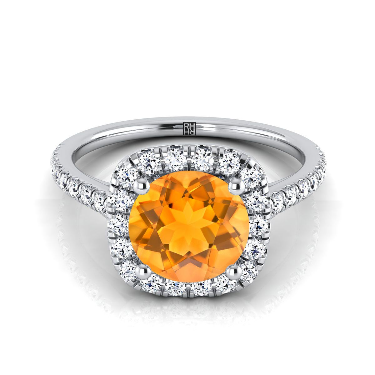 18K White Gold Round Brilliant Citrine Halo Diamond Pave Engagement Ring -1/3ctw