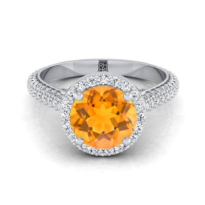 18K White Gold Round Brilliant Citrine Micro-Pavé Halo With Pave Side Diamond Engagement Ring -7/8ctw