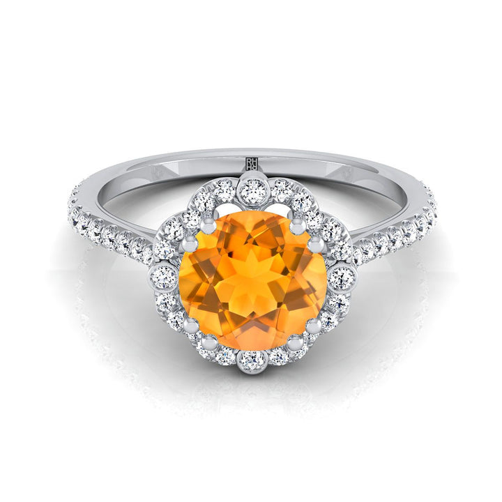 18k White Gold Engagement Ring With 6 Mm Round Citrine Center Stone And 12 Round Brilliant Diamonds Weighing 0.10ctw
