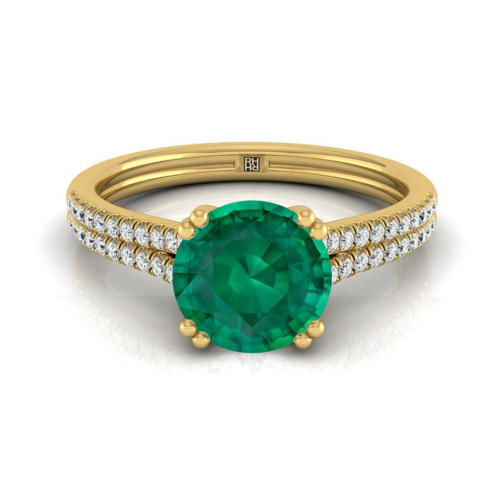 18K Yellow Gold Round Brilliant Emerald Double Row Double Prong French Pave Diamond Engagement Ring -1/6ctw