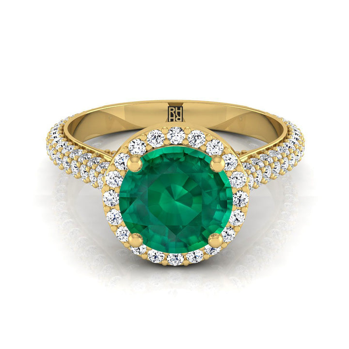 14K Yellow Gold Round Brilliant Emerald Micro-Pavé Halo With Pave Side Diamond Engagement Ring -7/8ctw