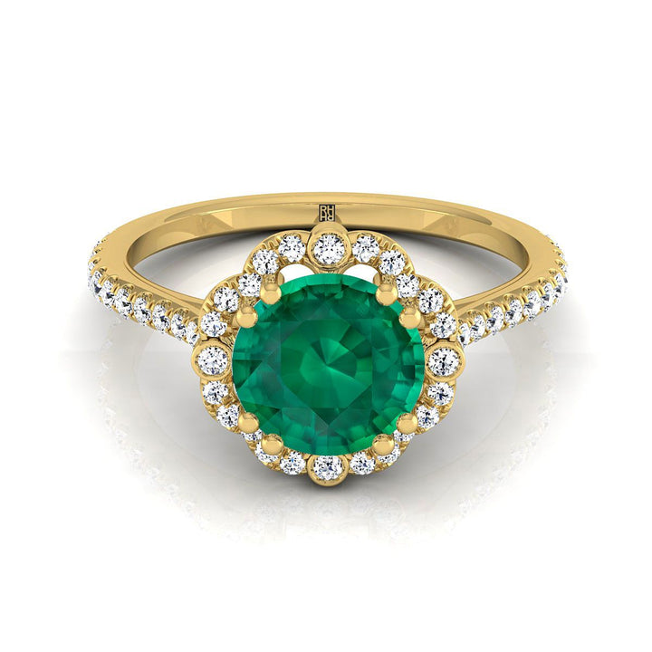 18k Yellow Gold Engagement Ring With 6 Mm Round Emerald Center Stone And 12 Round Brilliant Diamonds Weighing 0.10ctw