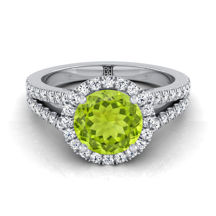 Platinum Round Brilliant Peridot Halo Center with French Pave Split Shank Engagement Ring -3/8ctw