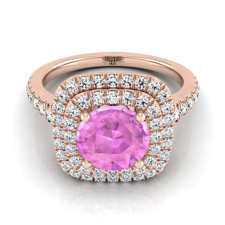 14K Rose Gold Round Brilliant Pink Sapphire Double Halo with Scalloped Pavé Diamond Engagement Ring -1/2ctw
