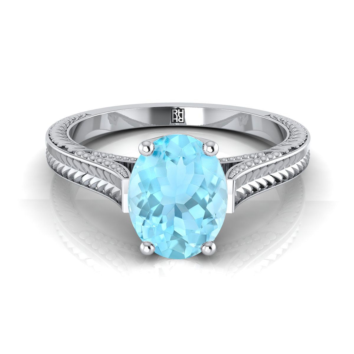 18k White Gold Engagement Ring With 8 X 6 Mm Oval Aquamarine Center Stone And Millgrain And Antique Inspired Design Finish