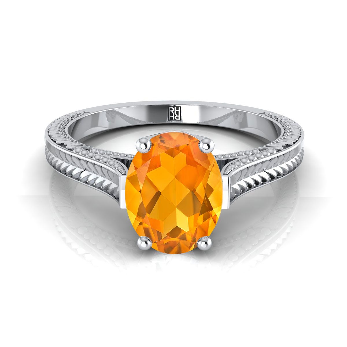 Platinum Engagement Ring With 8 X 6 Mm Oval Citrine Center Stone And Millgrain And Antique Inspired Design Finish