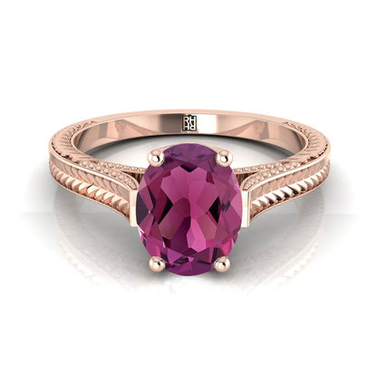 14K Rose Gold Oval Garnet Hand Engraved Vintage Cathedral Style Solitaire Engagement Ring