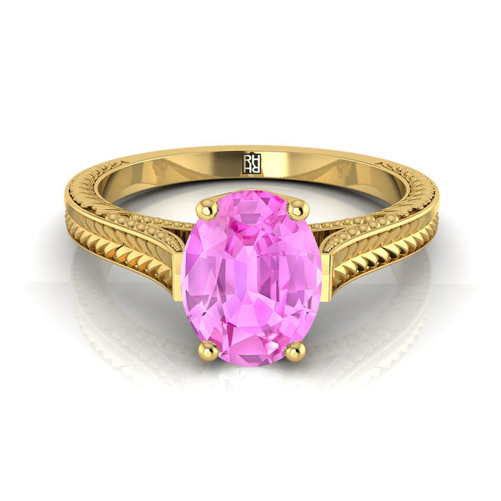14K Yellow Gold Oval Pink Sapphire Hand Engraved Vintage Cathedral Style Solitaire Engagement Ring