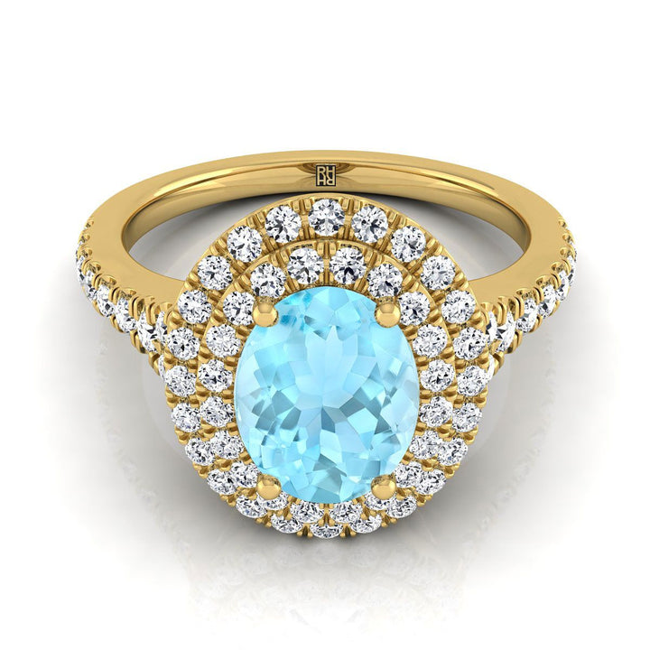18K Yellow Gold Oval Aquamarine Double Halo with Scalloped Pavé Diamond Engagement Ring -1/2ctw