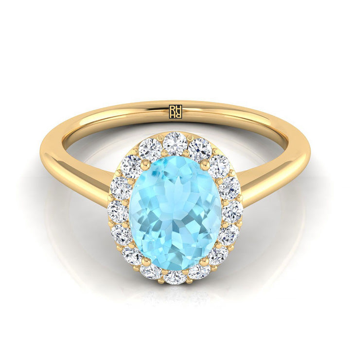 18K Yellow Gold Oval Aquamarine Shared Prong Diamond Halo Engagement Ring -1/5ctw