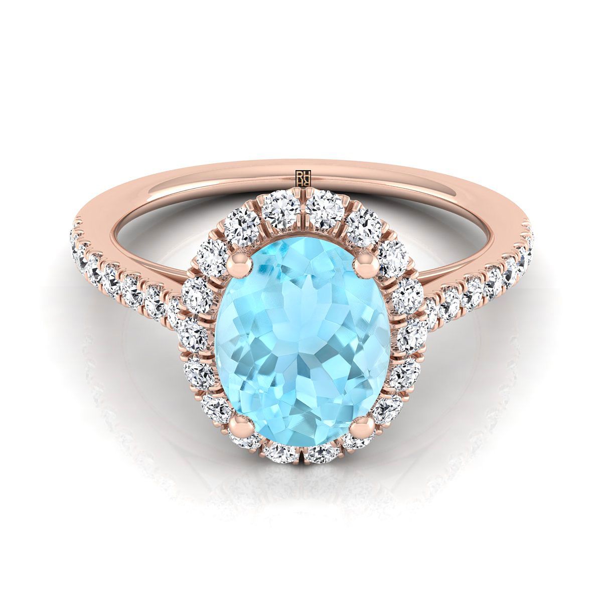 14K Rose Gold Oval Aquamarine Petite Halo French Diamond Pave Engagement Ring -3/8ctw