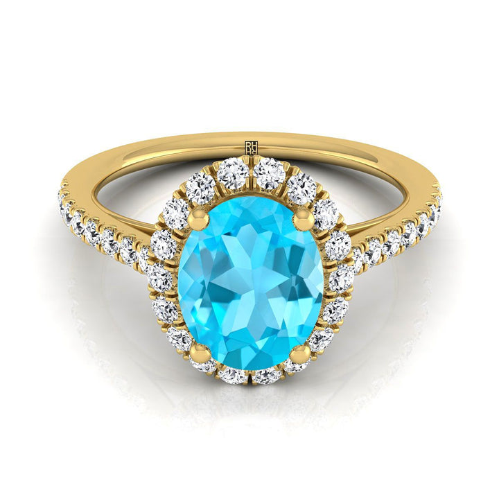 18K Yellow Gold Oval Swiss Blue Topaz Petite Halo French Diamond Pave Engagement Ring -3/8ctw