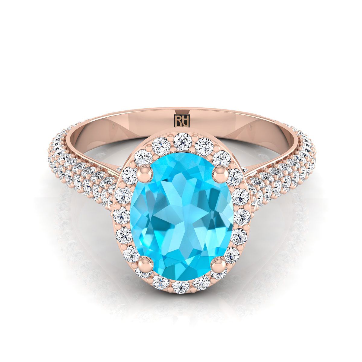 14K Rose Gold Oval Swiss Blue Topaz Micro-Pavé Halo With Pave Side Diamond Engagement Ring -7/8ctw