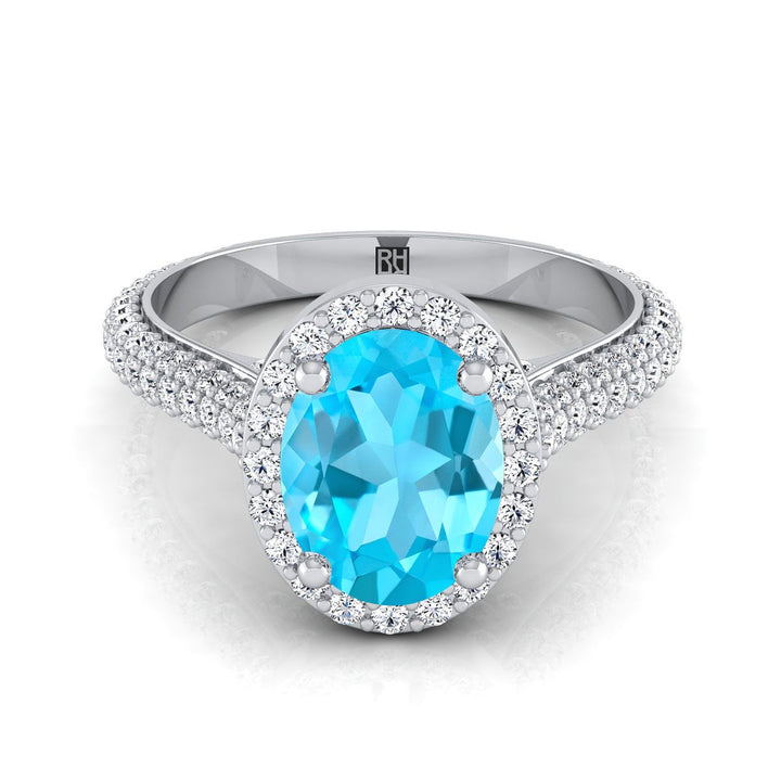 Platinum Oval Swiss Blue Topaz Micro-Pavé Halo With Pave Side Diamond Engagement Ring -7/8ctw