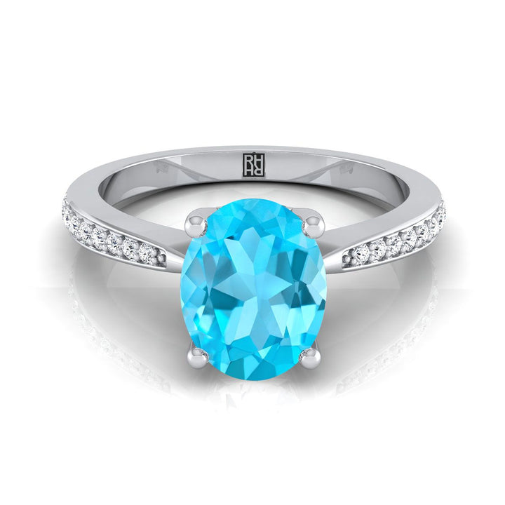 18K White Gold Oval Swiss Blue Topaz Tapered Pave Diamond Engagement Ring -1/8ctw