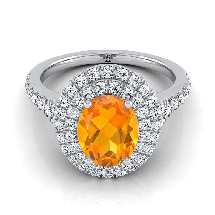 14K White Gold Oval Citrine Double Halo with Scalloped Pavé Diamond Engagement Ring -1/2ctw