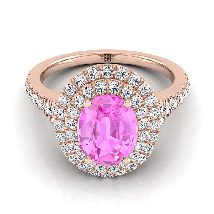 14K Rose Gold Oval Pink Sapphire Double Halo with Scalloped Pavé Diamond Engagement Ring -1/2ctw