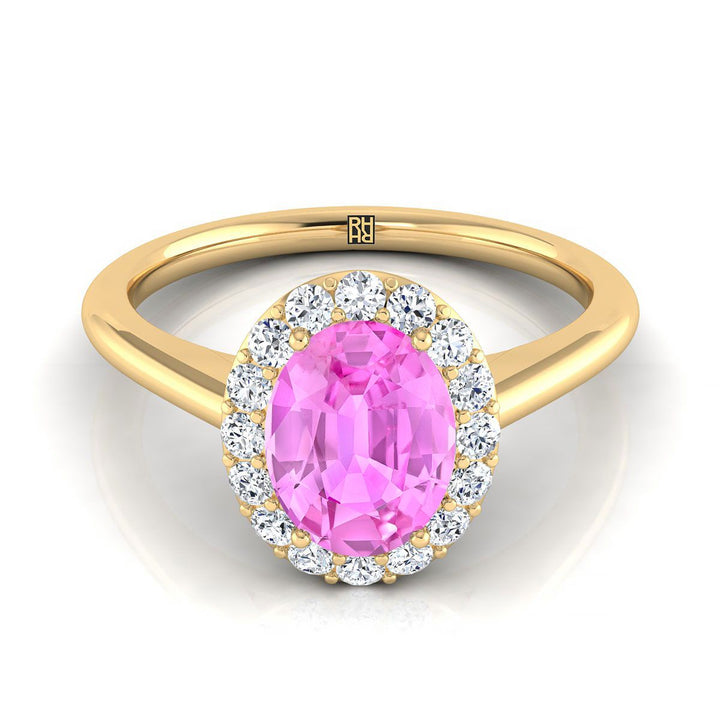 18K Yellow Gold Oval Pink Sapphire Shared Prong Diamond Halo Engagement Ring -1/5ctw