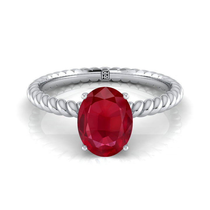 18k White Gold Engagement Ring With 8 X 6mm Oval Ruby Center Stone And Rope Design Shank