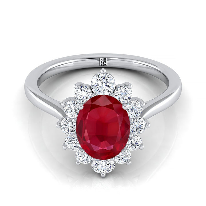 14K White Gold Oval Ruby Floral Diamond Halo Engagement Ring -1/2ctw