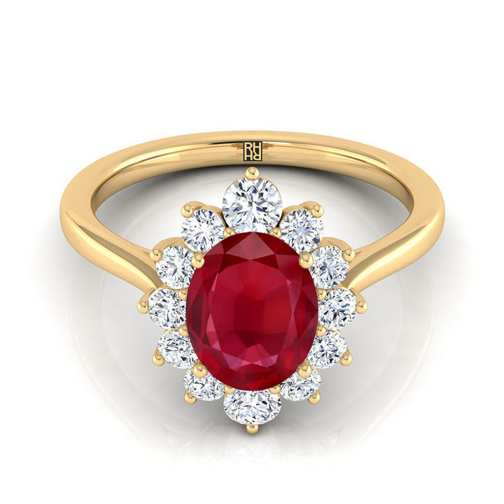 18k Yellow Gold Engagement Ring With 8 X 6mm Oval Ruby Center Stone And 12 Brilliant Cut Diamonds Weighing 0.48ctw
