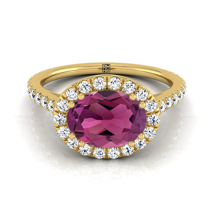 18K Yellow Gold Oval Garnet Horizontal Fancy East West Diamond Halo Engagement Ring -1/2ctw