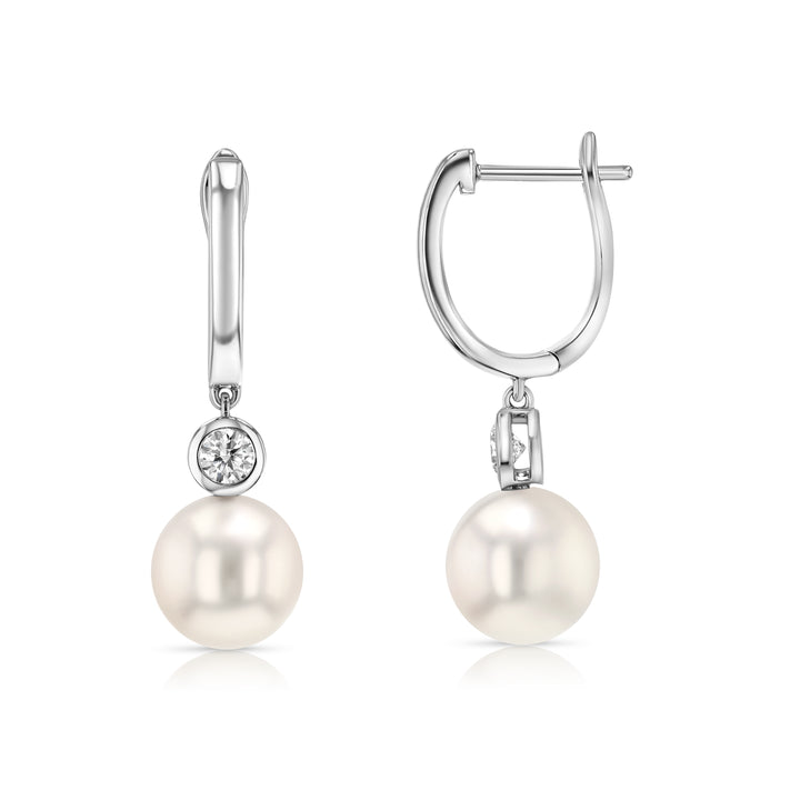 14 karat white gold earrings with 8mm akoya pearls and 0.20ctw bezel set round I/VS diamonds