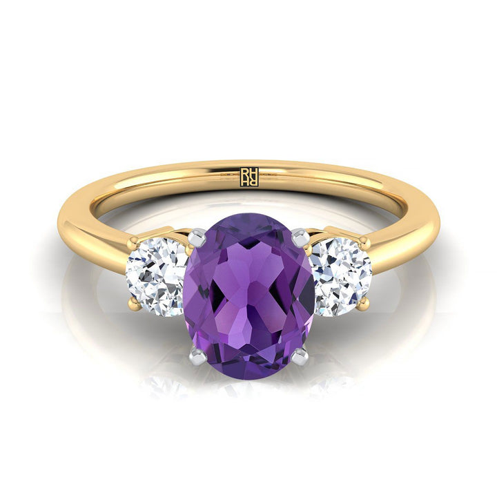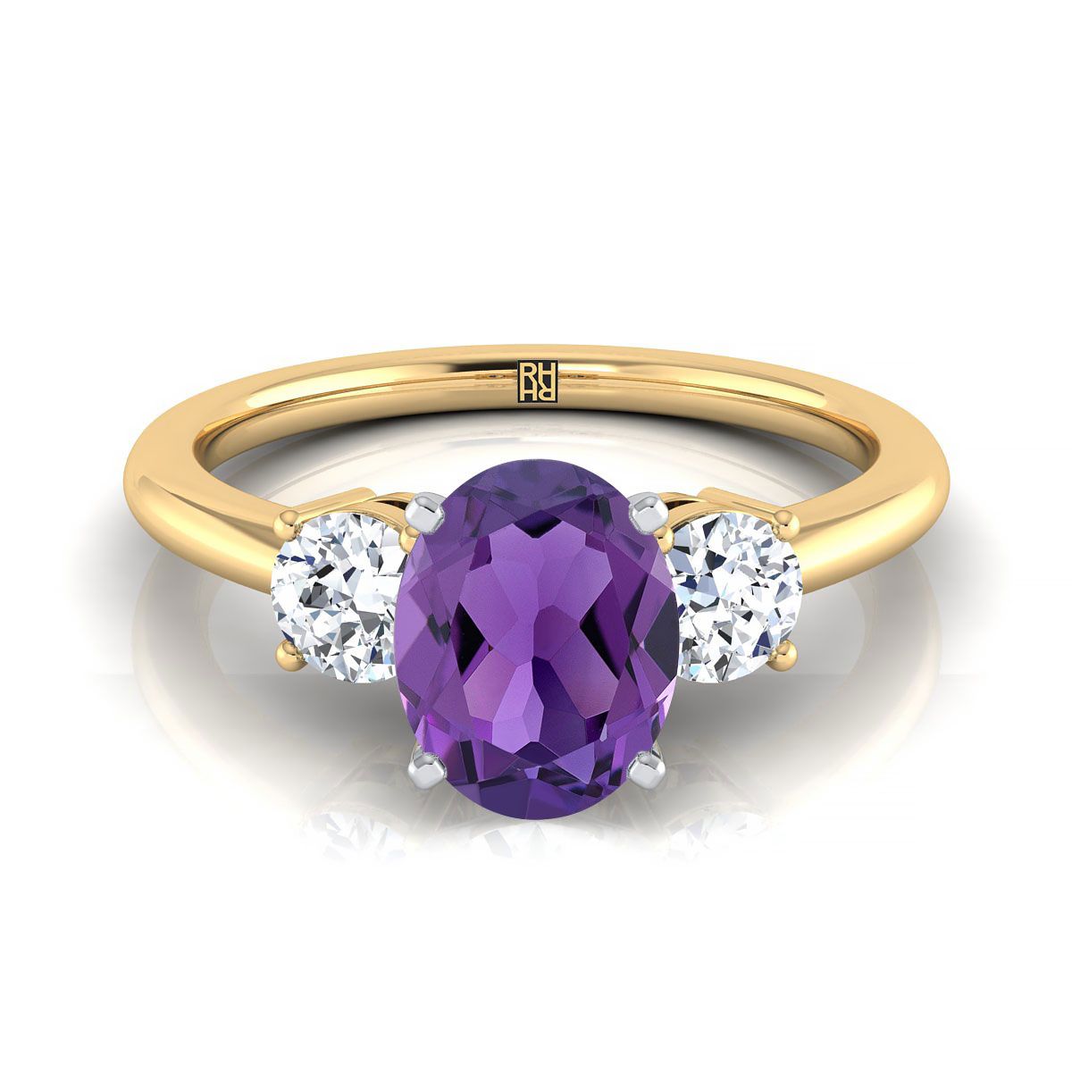 18K Yellow Gold Oval Amethyst Perfectly Matched Round Three Stone Diamond Engagement Ring -1/4ctw