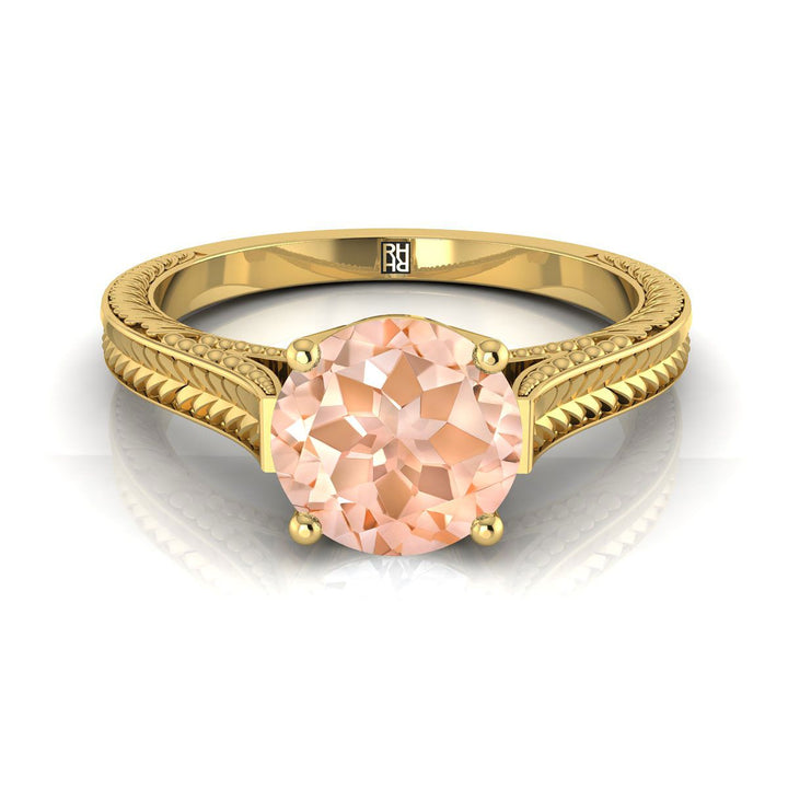 14K Yellow Gold Round Brilliant Morganite Hand Engraved Vintage Cathedral Style Solitaire Engagement Ring