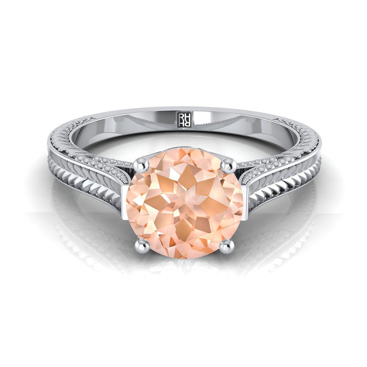 18K White Gold Round Brilliant Morganite Hand Engraved Vintage Cathedral Style Solitaire Engagement Ring