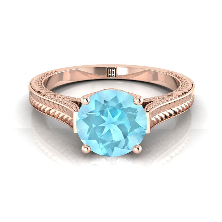 14K Rose Gold Round Brilliant Aquamarine Hand Engraved Vintage Cathedral Style Solitaire Engagement Ring