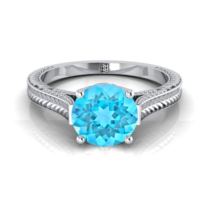 14K White Gold Round Brilliant Swiss Blue Topaz Hand Engraved Vintage Cathedral Style Solitaire Engagement Ring