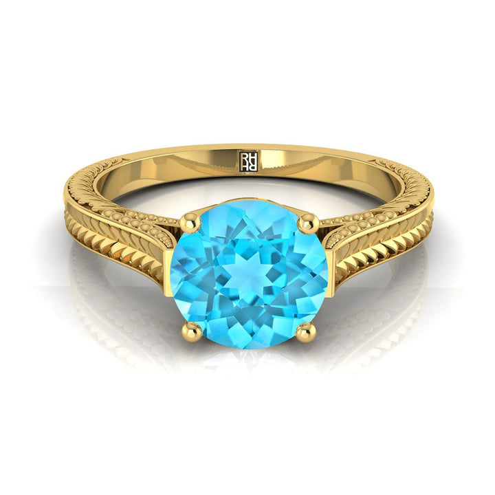 14K Yellow Gold Round Brilliant Swiss Blue Topaz Hand Engraved Vintage Cathedral Style Solitaire Engagement Ring