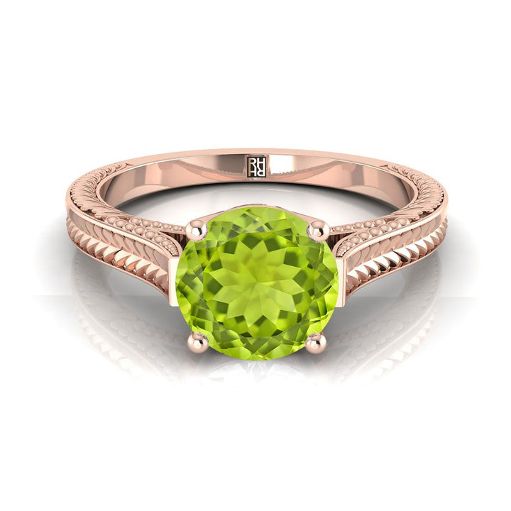 14K Rose Gold Round Brilliant Peridot Hand Engraved Vintage Cathedral Style Solitaire Engagement Ring