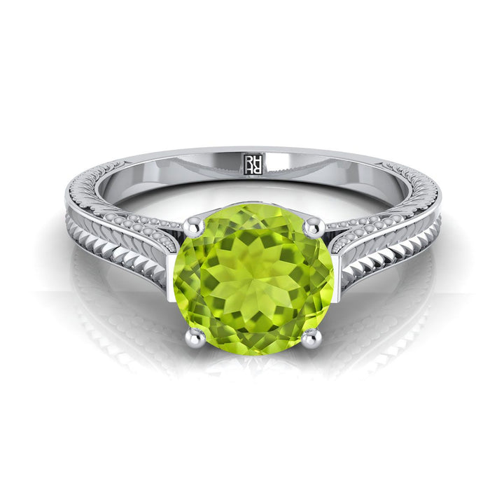 18K White Gold Round Brilliant Peridot Hand Engraved Vintage Cathedral Style Solitaire Engagement Ring