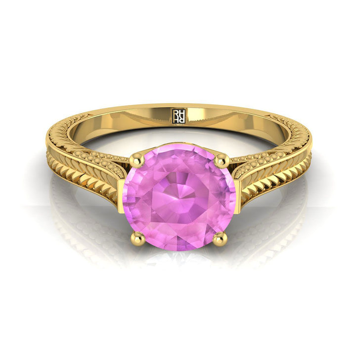 14K Yellow Gold Round Brilliant Pink Sapphire Hand Engraved Vintage Cathedral Style Solitaire Engagement Ring
