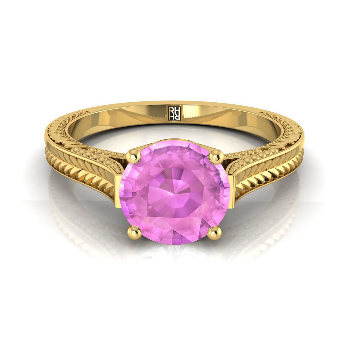 18K Yellow Gold Round Brilliant Pink Sapphire Hand Engraved Vintage Cathedral Style Solitaire Engagement Ring