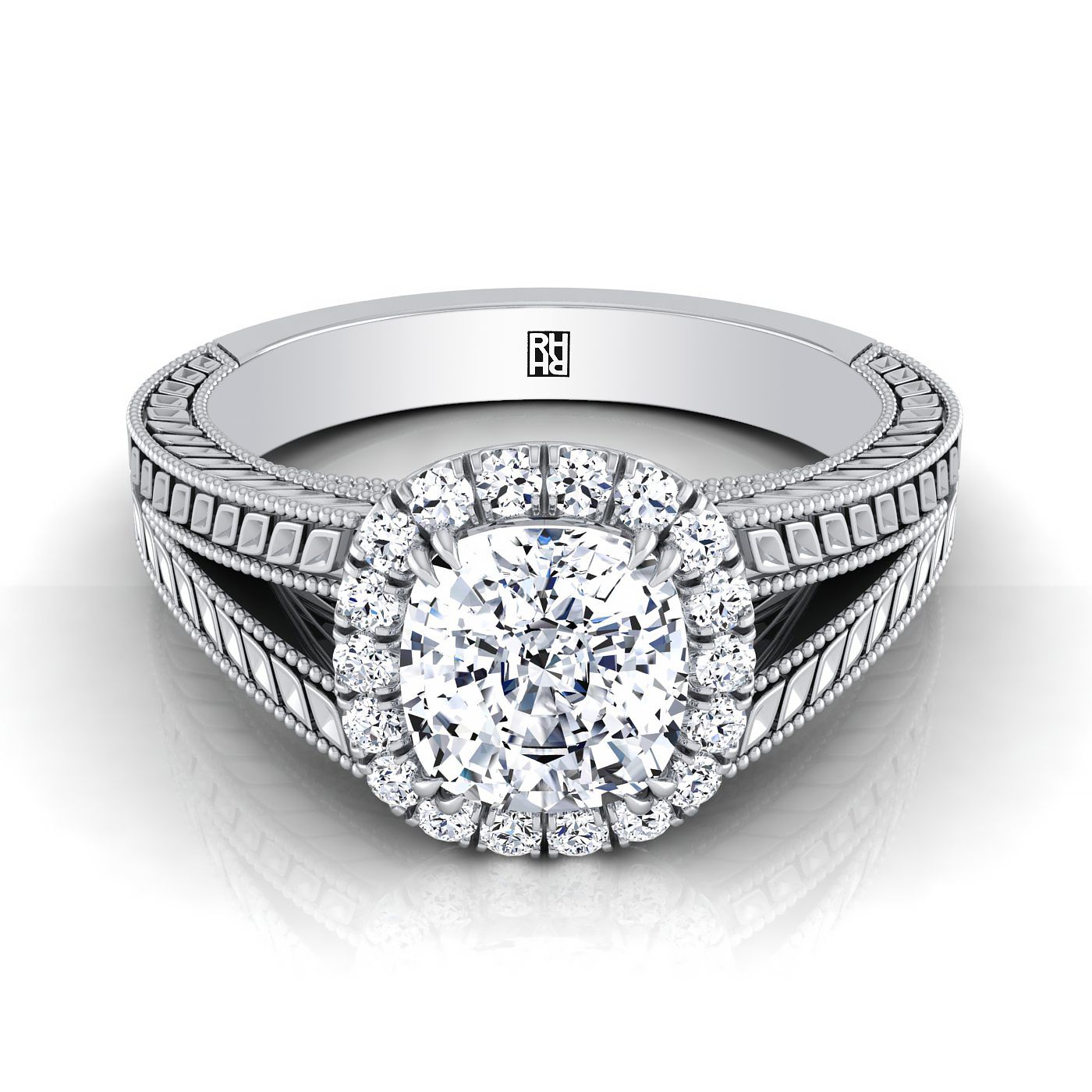 18K White Gold Cushion Vintage Inspired Wheat Split Shank Diamond Halo Engagement Ring