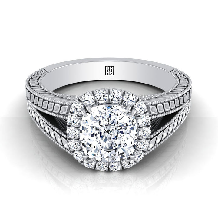 Platinum Cushion Vintage Inspired Wheat Split Shank Diamond Halo Engagement Ring