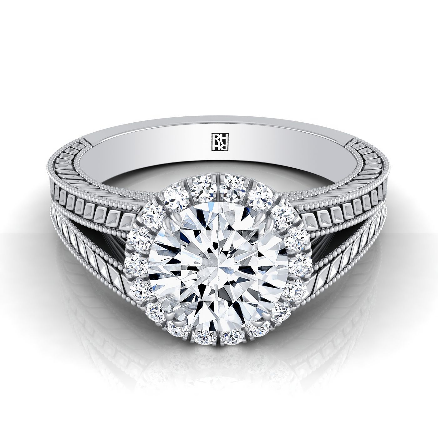 14K White Gold Round Brilliant Vintage Inspired Wheat Split Shank Diamond Halo Engagement Ring
