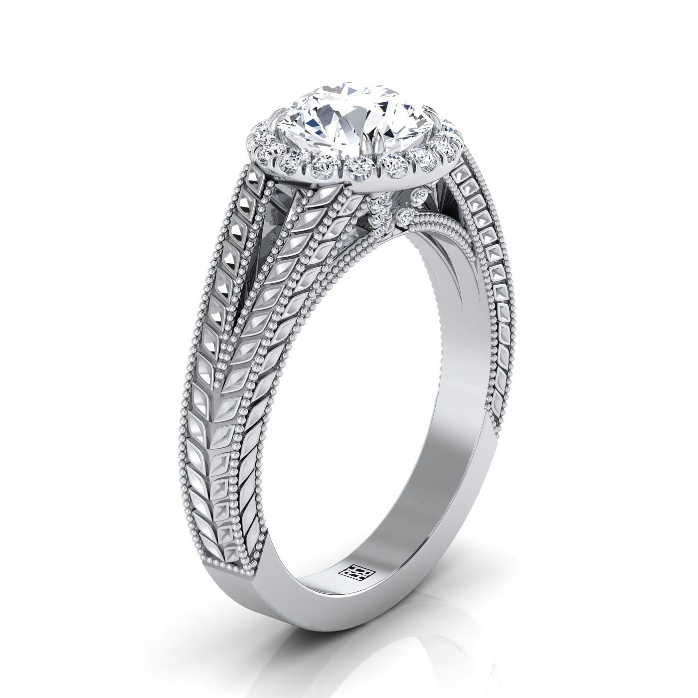 18K White Gold Round Brilliant Vintage Inspired Wheat Split Shank Diamond Halo Engagement Ring