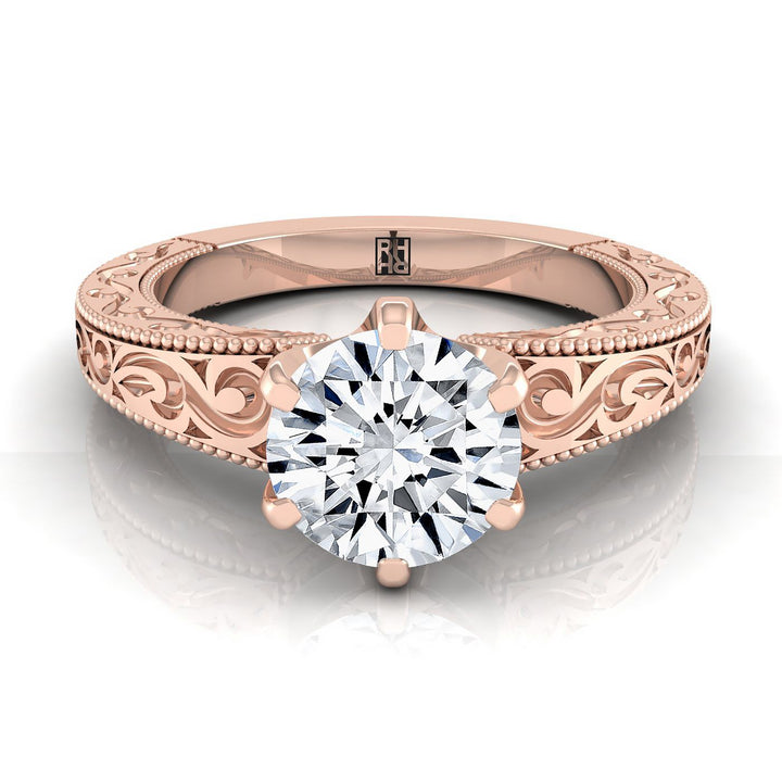 14K Rose Gold Round Brilliant Hand Engraved Scroll Vintage Solitaire Engagement Ring