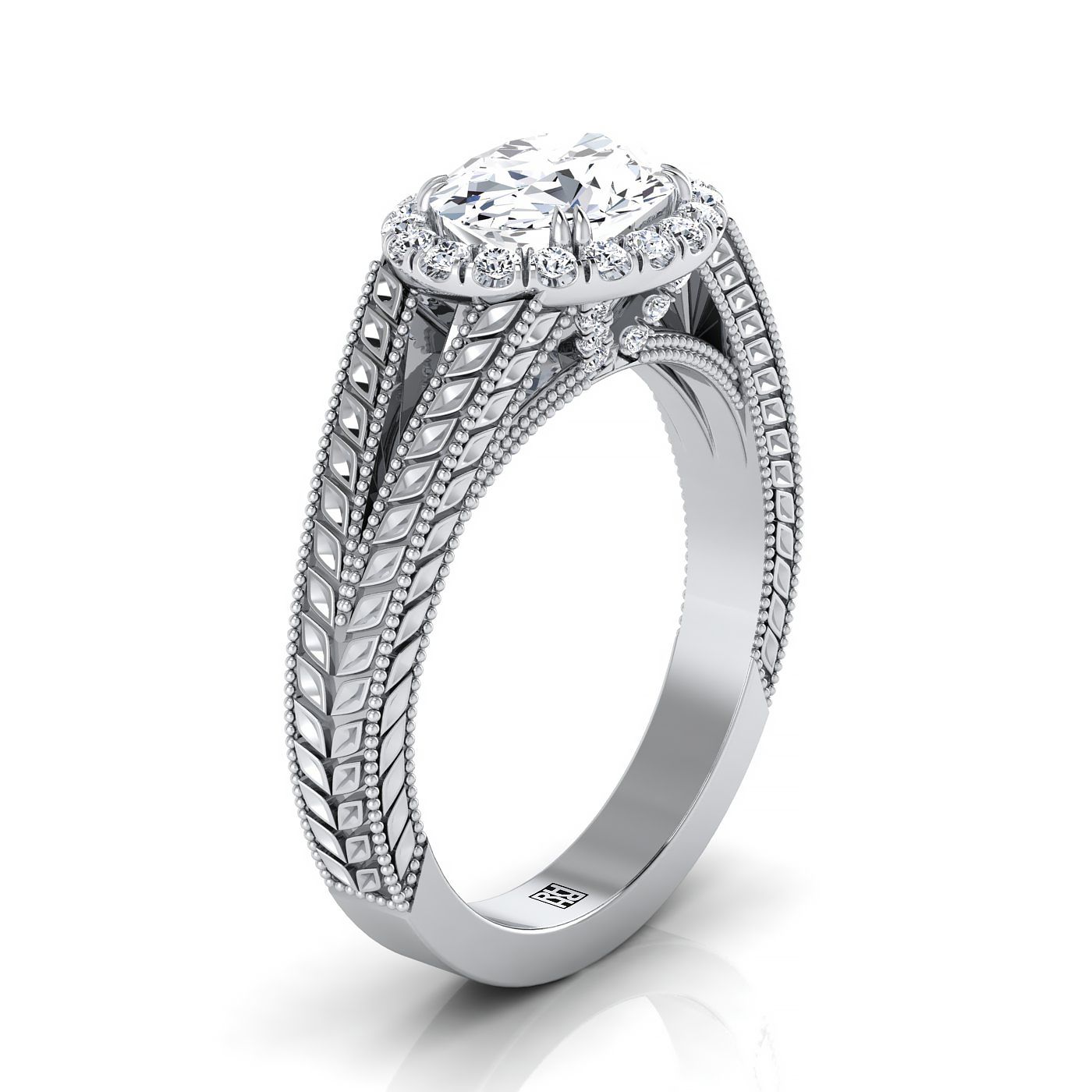 14K White Gold Oval Vintage Inspired Wheat Split Shank Diamond Halo Engagement Ring