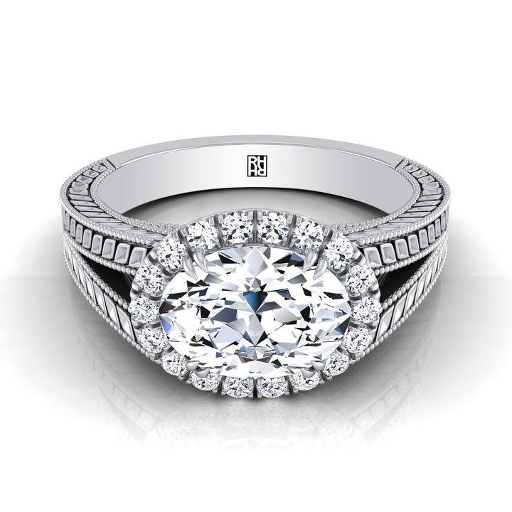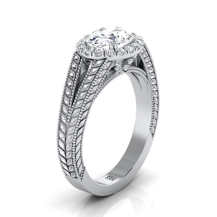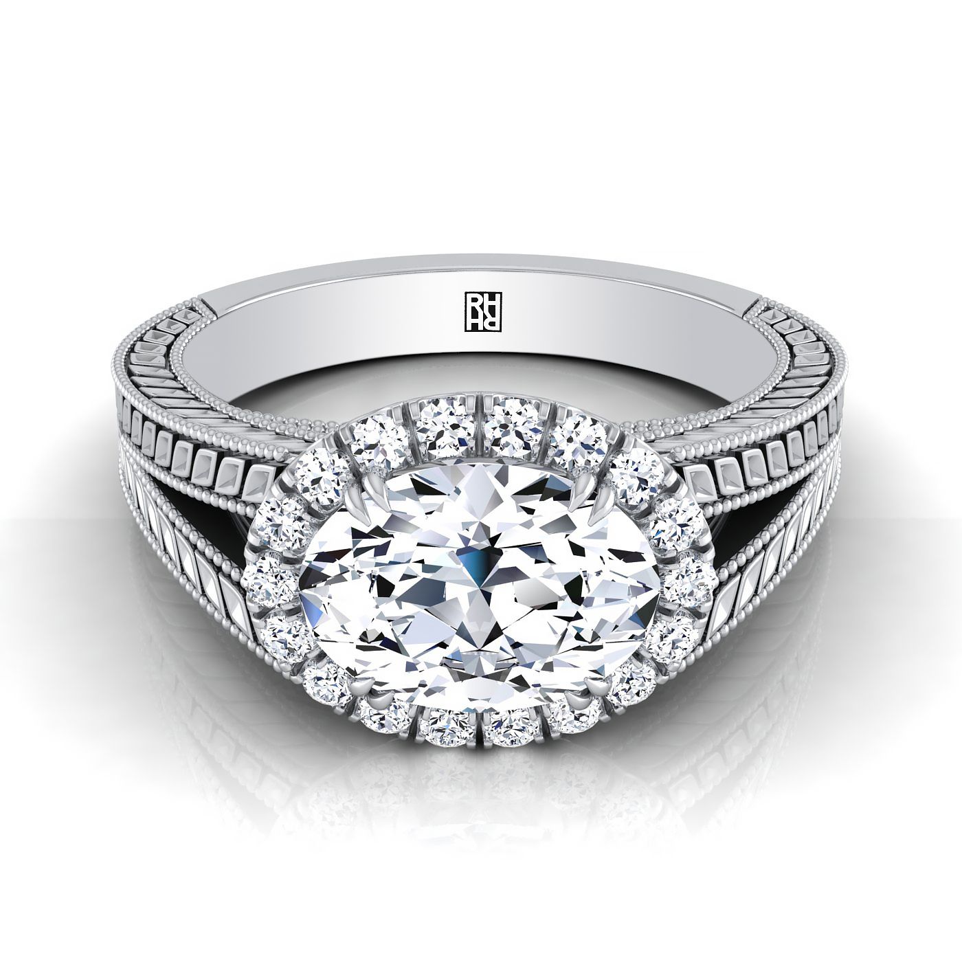 18K White Gold Oval Vintage Inspired Wheat Split Shank Diamond Halo Engagement Ring